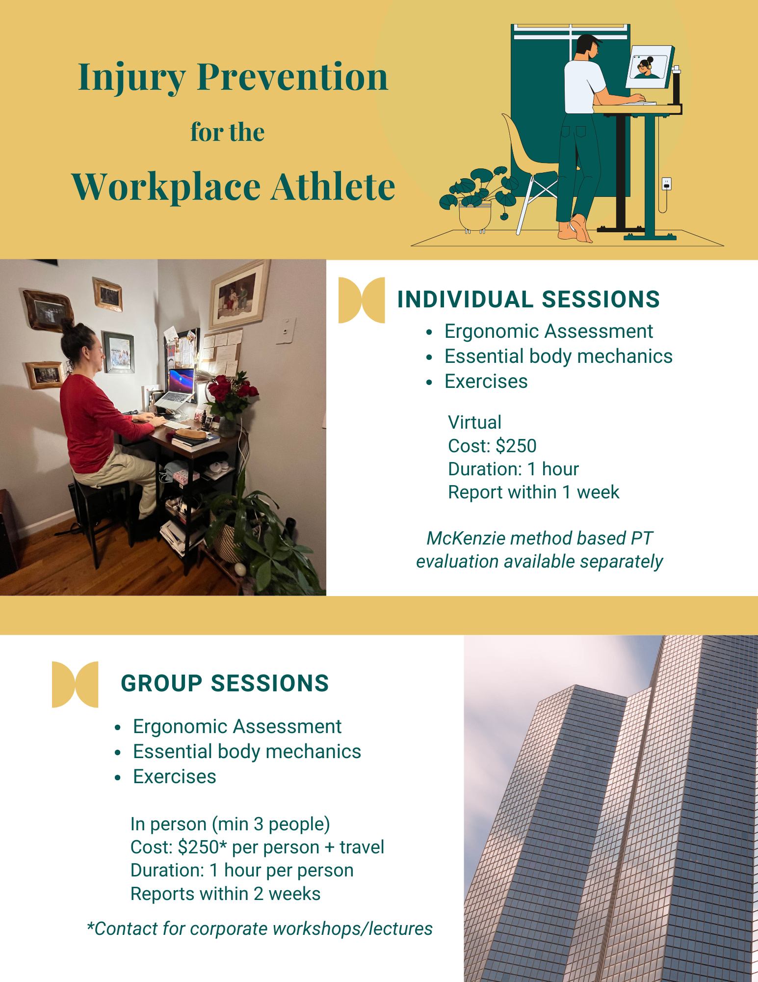 This includes an in person interview of the individual with a focus on overall health, work and recreational lifestyle and a visit to the workplace for ergonomics and posture assessment.Upon completion of the initial assessment a detailed report will be provided with the necessary recommendations.